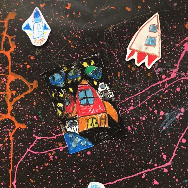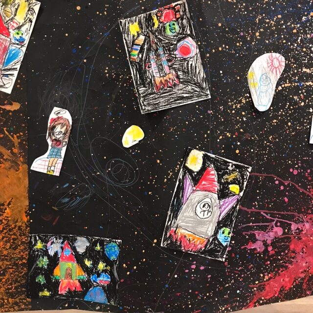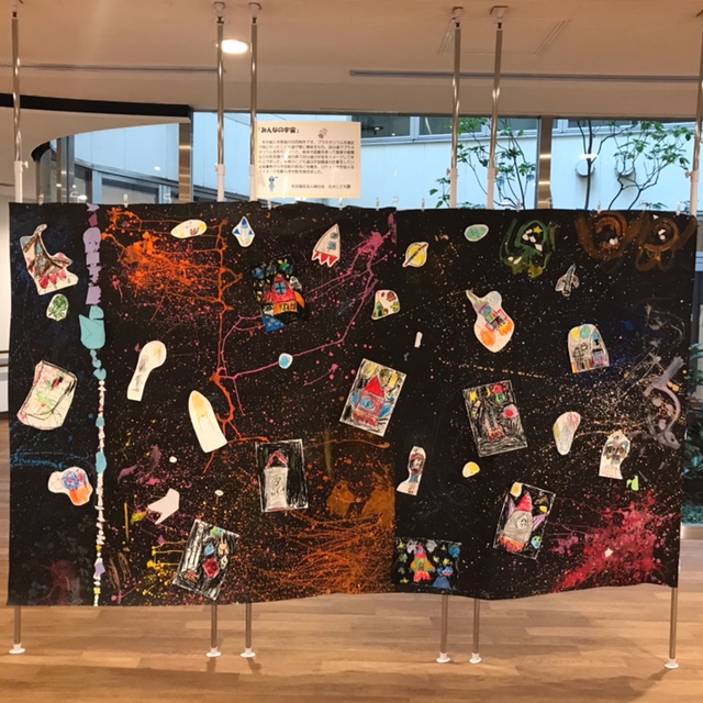 プラネタリウムを遠足で見にいった子ども達が星の興味を持ち、「自分達でプラネタリウムを作りたい!」と絵本や図鑑を使って星座や星雲などの色を調べ、絵の具で自分達の宇宙をイメージして作ってくれたそうです。