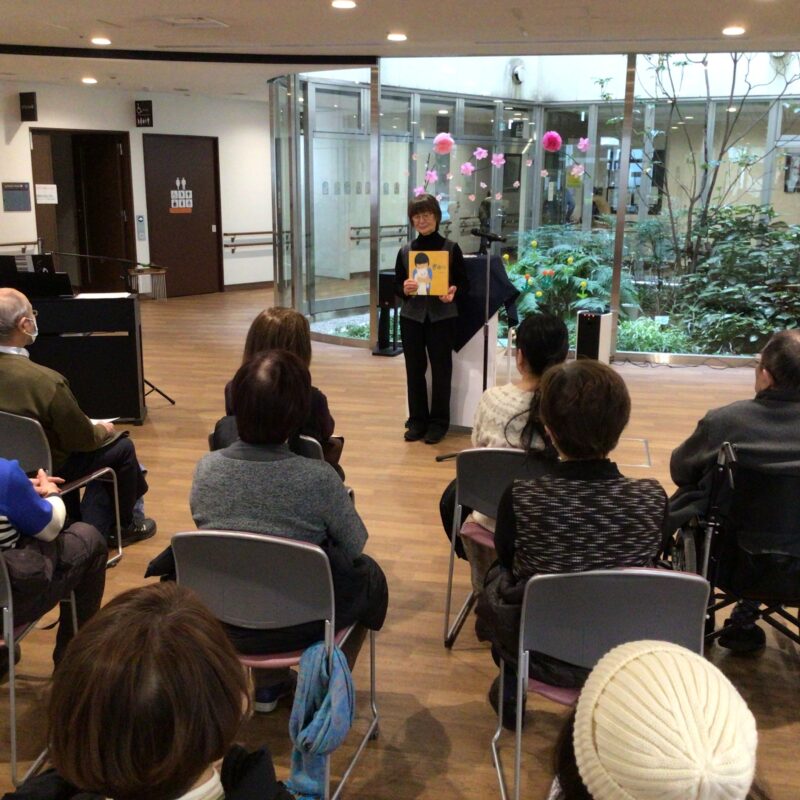 春にちなんだ「花咲か爺さん」の絵本の読み聞かせや、中谷さんの素晴らしい歌声を聞かせていただきました。また、平塚橋ゆうゆうプラザで練習されているご利用者とのトランペットとのコラボや、最後は観覧の皆さんと「見上げてごらん夜の星を」、「上を向いて歩こう」を歌い、楽しい時間となりました。