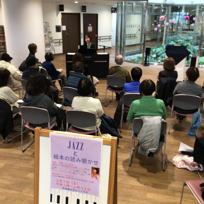 ジャズシンガーの中谷泰子さんと絵本読み聞かせグループの「はぴねす」さんにお越しいただき、「ジャズと絵本の読み聞かせ」を開催しました。