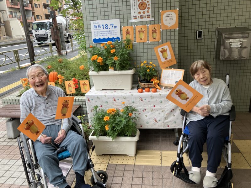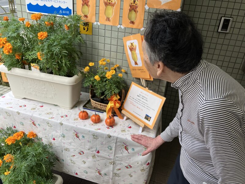 キバナコスモス、マリーゴールドのあざやかなオレンジに囲まれて写真を撮りました。認知症啓発キャラクターのくるみちゃんを手に取り、皆さん笑顔で「はい、ポーズ!」。