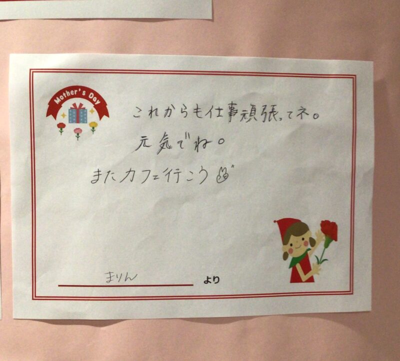 「いつもご飯を作ってくれてありがとう」「お仕事頑張ってね」「これからも体に気をつけて頑張ってね」など温かいメッセージが並びました。