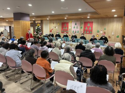 「ふるさと」「浜辺の歌」「見上げてごらん夜の星を」「きよしこの夜」「ホワイトクリスマス」と馴染みの曲目に会場はハンドベルの温かみのある音色とご利用者の歌声が重なりました。