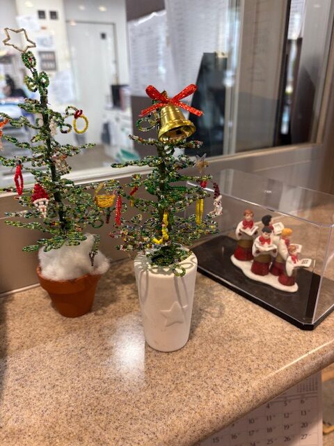 ゆうゆうプラザではステンドグラスのクリスマスツリーやハワイアンなサンタクロース、可愛いビーズのクリスマスツリーや聖歌隊の置物を飾りました。