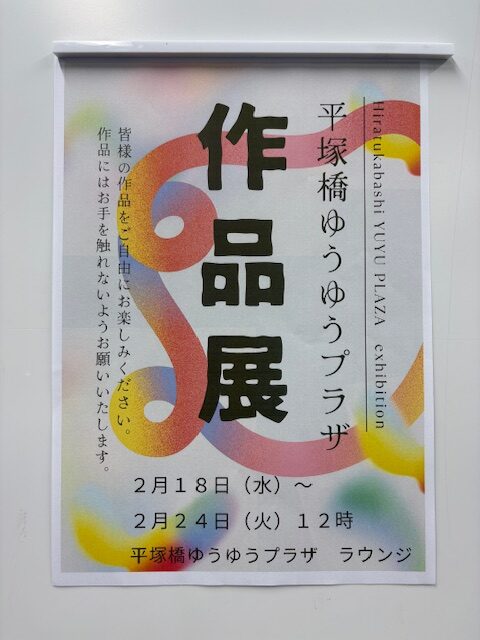 内容:平塚橋ゆうゆうプラザで年間通して活動されている皆さまの作品(習字、手芸、折り紙)、自主事業の講座(布ぞうり、編み物、ぬり絵、川柳)等の作品の展示等