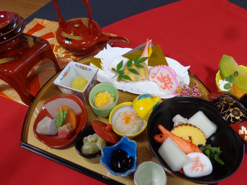 祝雑煮、数の子、黒豆、栗きんとん…。華やかなおせち料理が並び