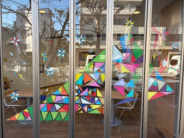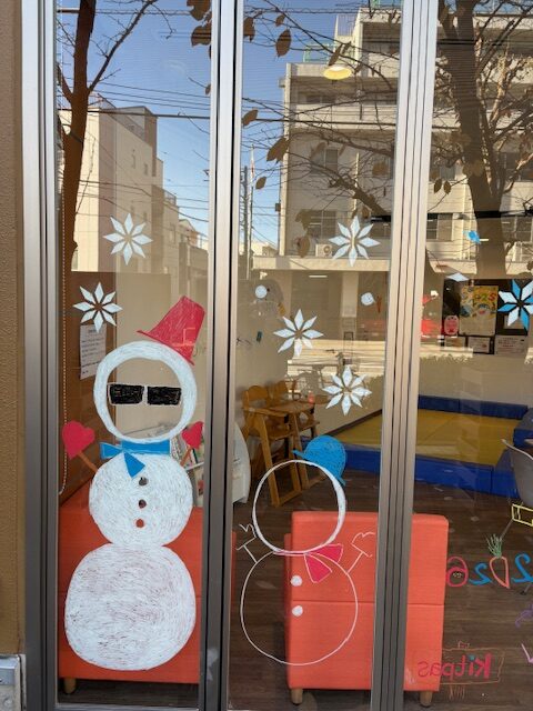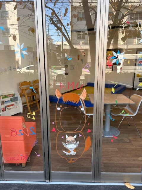 キットパス(口に入れても安全なチョーク)を使用し、ウッドデッキ横のガラス窓に素敵な絵を描いて下さいました。