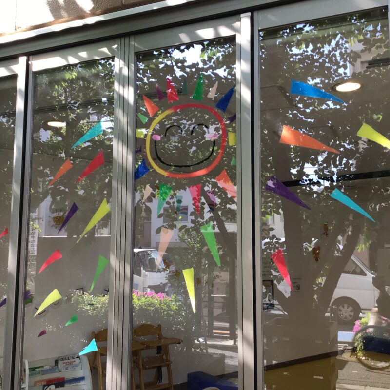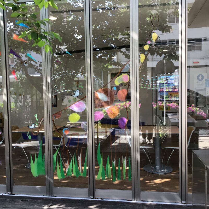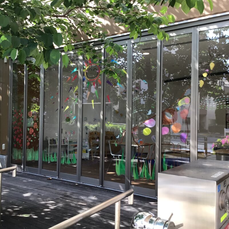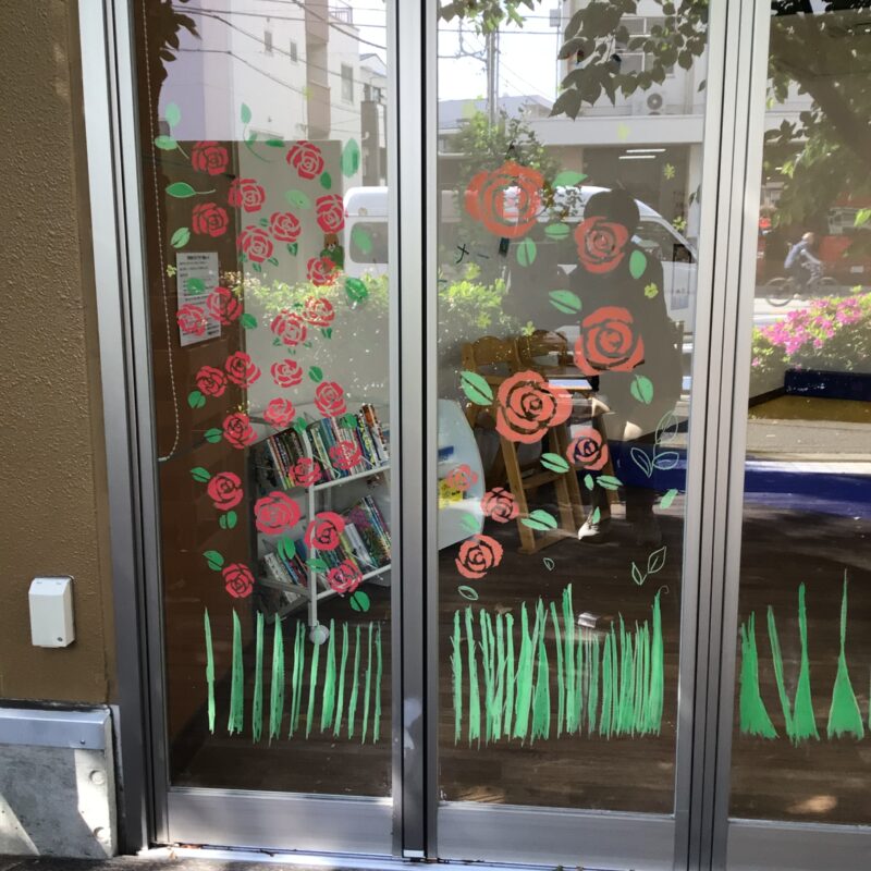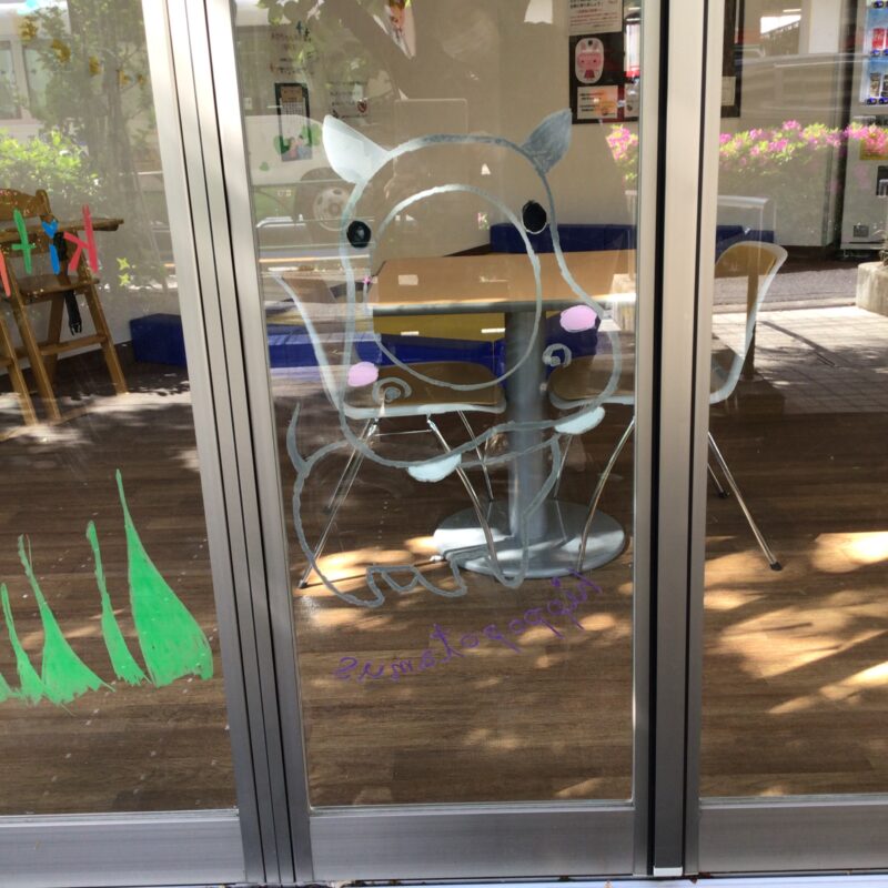 キットパス(口に入れても安全なチョーク)を使用し、ウッドデッキ横のガラス窓に「キリン」、顔はめ撮影が楽しめる「カバ」や鮮やかな「バラ」、元気いっぱいの「太陽」など、色とりどりの絵を描いて下さいました。ウッドデッキの桜の木の緑と、窓ガラス越しに見えるイラストが重なり、とても素敵な景色になっています。