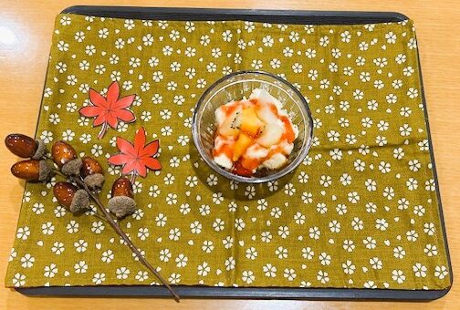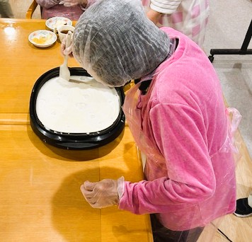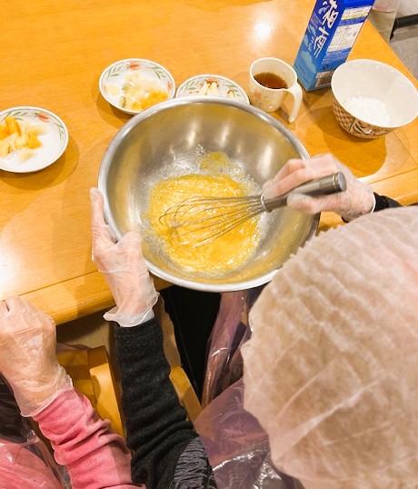砂糖、卵、小麦粉、牛乳をあらかじめ混ぜてから、ホットプレートで熱します。少しずつ固まってくるのでダマにならないようにグルグル混ぜ続けると、カスタードクリームの出来上がり。出来たては、甘くてモチっと軟らか食感。刻んだキウイ、白桃、黄桃、カステラで自由に盛り付けて「いただきま~す!」