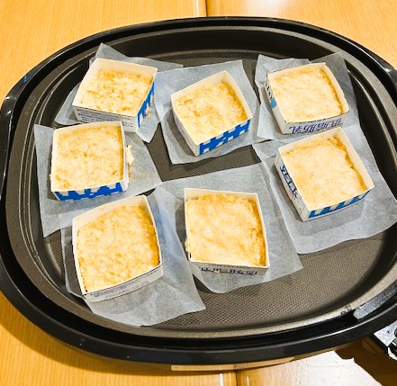 型は洗って乾かした牛乳パックを再利用。生地を入れて、ホットプレートへ。ひっくり返して焼き色がついた時には、みんなで拍手~。