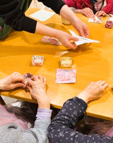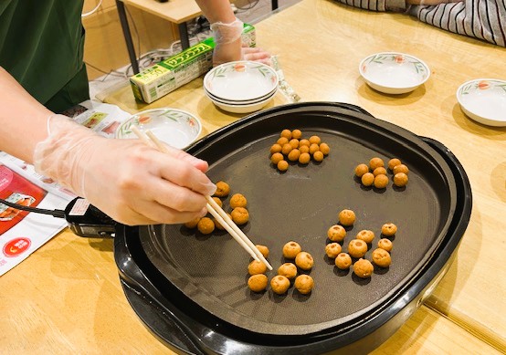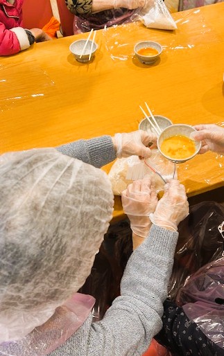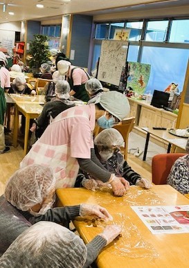 今回は、和菓子職人だった方の参加もあり、「(親指の根元を指さしながら」練る時はここで練るんだよ。」「もう少ししっかりと丸くすればくずれないよ」とアドバイスをいただきながら行い、きれいな丸型のしっとりとしたボーロを皆さんで福がくるようにと口に含みました。